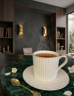 • Materiali: Porcelan cilësor. • Dizajni: Sipërfaqe me vija vertikale shumë elegante. • Detaje Luksoze: Shirit i hollë argjendi në buzë. • Ngjyrë e Bardhë: E pastër dhe e lehtë për t'u kombinuar. • Përdorimi: Ideal për çaj ose kafe në raste festive.