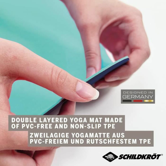 The Schildkröt fitness mat is a product designed to offer comfort and functionality during yoga practice or other floor exercises. Made of PVC material, this mat measures 180 x 60 cm, providing enough space for stretching, poses, and training with freedom of movement. Despite the mention of “PVC-free” in the description, the main material indicated is PVC, known for its durability and ability to absorb impact and prevent slipping, which is essential for maintaining stability in physical activities requiring balance and safety. Its non-slip texture helps avoid unwanted movements, allowing safe use even on smooth surfaces. The two-tone design in navy blue and mint adds a modern and attractive look, combining functionality with style. The mat is a versatile solution for users seeking a practical, lightweight, and durable product, ideal for both indoor and outdoor use. In summary, this Schildkröt mat combines suitable dimensions, a material designed for durability, and a surface that promotes safety, making it an essential accessory for those who regularly practice yoga or similar exercises.