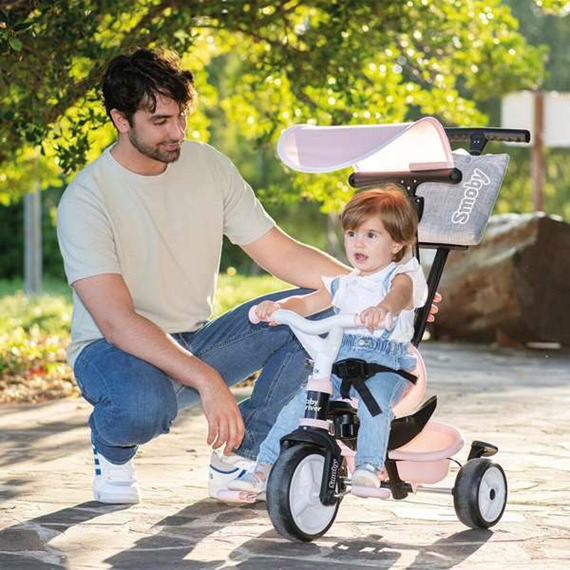 The Baby Driver Confort tricycle from the brand Smoby is a children's vehicle designed for kids from 2 years old, ideal for promoting psychomotor development and coordination in young children during their first outdoor rides and play. This tricycle stands out for its metallic pink color, which gives it an attractive and modern finish, and is mainly made of durable plastic, ensuring a lightweight yet sturdy structure for safe and long-lasting use. It features an adjustable seat that allows adapting the comfort position as the child grows, facilitating proper posture while pedaling and extending its useful life. Its ergonomic and stable design, with three wheels, ensures safe and controlled riding for children beginning to learn mobility on wheels, enhancing their autonomy and balance. Additionally, it is produced through a combination of China and Spain, ensuring proper quality control in manufacturing and distribution. In summary, the Baby Driver Confort Pink tricycle is a practical and functional option to accompany children on their first wheeled adventures, combining safety, comfort, and an appealing design suited to their needs and preferences.