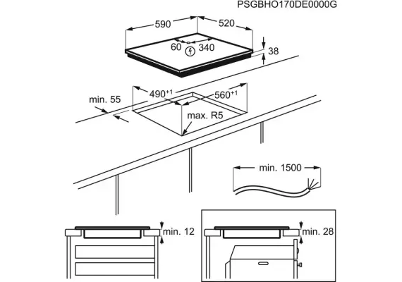 Përmasat e pllakës (Gjerësia x Thellësia): 590 × 520 mm Përmasat për montim (H × G × Th): 38 × 560 × 490 mm