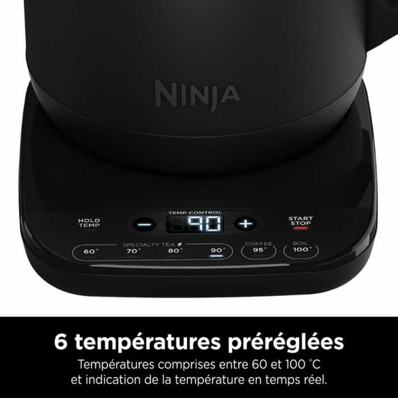 The KT200EU kettle from the NINJA brand is an electric device designed to heat water quickly and efficiently, ideal for both home use and small offices. This kettle has a capacity of 1.7 liters, suitable for preparing several cups of hot water simultaneously, making it a practical choice for families or small groups. Made with a combination of stainless steel and high-quality plastic, it offers durability and a modern look in black that fits various kitchen styles. Its 3000 W power allows fast heating, reducing wait time to boil water—essential for those needing immediate results for infusions, coffee, or recipes requiring hot water. Additionally, the product is adapted for European (EU) plugs, ensuring compatibility and voltage safety. The material combination ensures resistance to daily use and easy cleaning, while the design includes common features in modern kettles such as automatic shut-off and dry-boil protection, standard mechanisms in this product range to guarantee both user safety and convenience. Overall, the NINJA KT200EU is a robust, efficient, and functional kettle that meets basic needs and energy consumption requirements to heat water quickly and reliably.