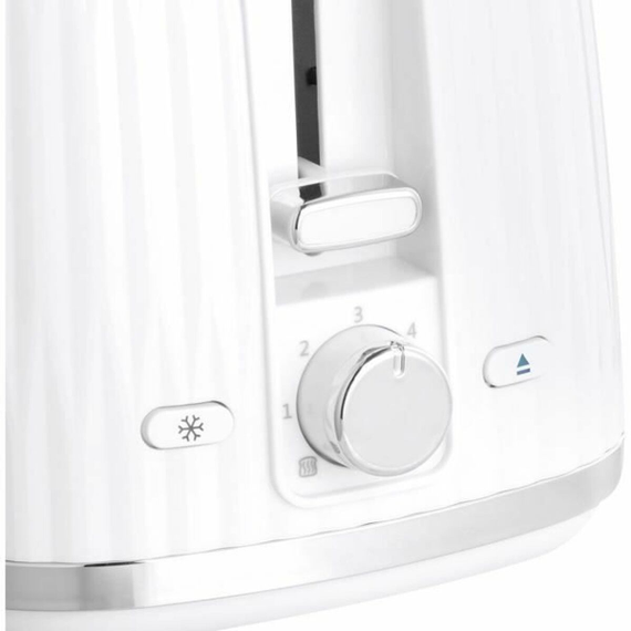 The Russell Hobbs Eden toaster is a household appliance designed to offer functionality and convenience for daily kitchen use, featuring a practical and efficient design. Equipped with 800 W power, it ensures fast and even toasting, ideal for preparing breakfasts or snacks with two slices simultaneously thanks to its two wide slots. Its structure is made of white plastic, a material that provides lightness and easy cleaning, while blending well with modern or minimalist settings. Toasting control is managed by a rotary knob that allows precise adjustment of the desired browning level, offering an intuitive experience tailored to personal preferences. This type of control stands out for its simplicity and durability, making it ideal for users who value practicality. The combination of adequate power, functional materials, and ergonomic controls makes this Russell Hobbs toaster a reliable device with clear basic features, without extra complications. Its compact design and white finish allow it to fit easily on any countertop, taking up minimal space but with enough capacity for everyday use. In short, the Russell Hobbs Eden toaster represents a practical and effective solution for households seeking a simple, durable, and convenient appliance to toast bread evenly and quickly.