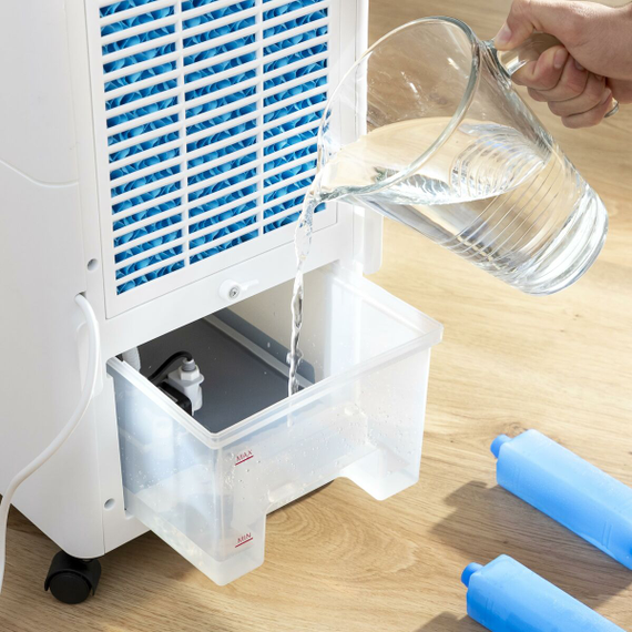 - Double tank, maximum cooling: this air cooler has a 5L lower tank and an upper tank with water diffuser which are interconnected. The flow of water is constant and keeps the filter wet (pump: up to 180 l/h). The lower tank is removable so it can be cleaned and filled. Approx. duration: 4 h.