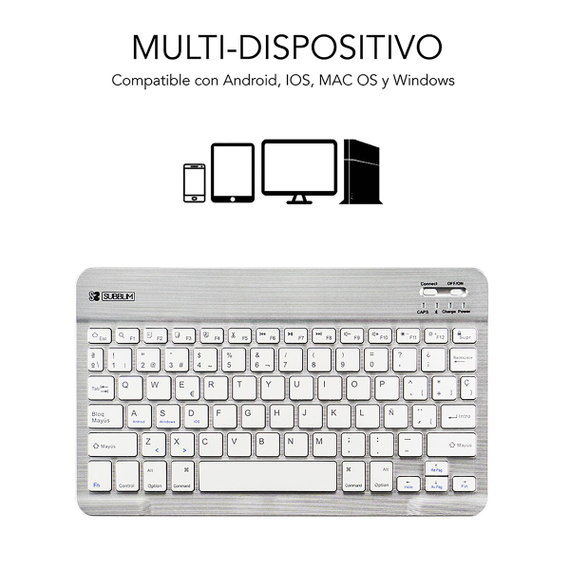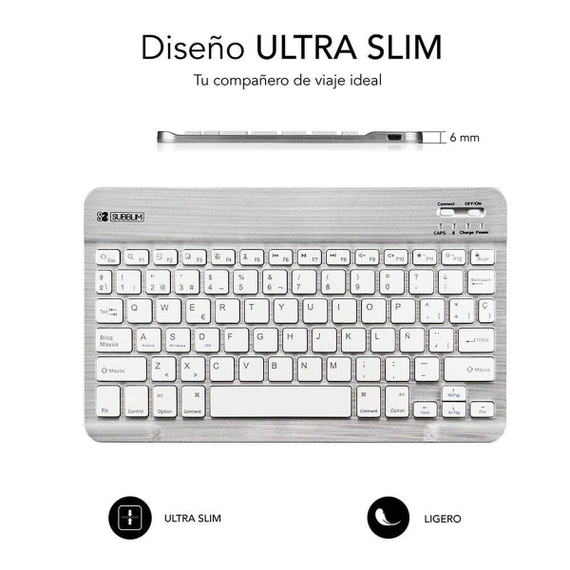 The Bluetooth keyboard Subblim SUB-KBT-SM0001 is a wireless solution designed for those seeking comfort and versatility in daily use, compatible with a wide range of devices such as phones, tablets, and media centers thanks to its Bluetooth 3.0 connectivity. This model stands out for its ultra-thin and ultra-light design, measuring just 6 mm thick with an elegant white and silver finish, making it easy to carry in bags, backpacks, or even between documents—ideal for mobile users or limited spaces. The keyboard features a Spanish QWERTY layout, ensuring a natural and efficient typing experience in Spanish, while its flat Chiclet-style keys use a scissor mechanism for precision, stability, and quiet typing. It also includes a long-lasting rechargeable lithium battery; it can be charged via USB while in use and has an automatic sleep function after ten minutes of inactivity to optimize energy consumption. The physical on/off switch makes power management easy and extends battery life during prolonged use. This wireless keyboard includes LED indicators for battery status, and thanks to its lightweight materials and compact design, it is ideal for professionals and users who need maximum mobility without sacrificing functionality or comfort at their workspace or on the go. In summary, the Subblim SUB-KBT-SM0001 is a modern and practical choice for those seeking efficiency and style in a Spanish Bluetooth keyboard.