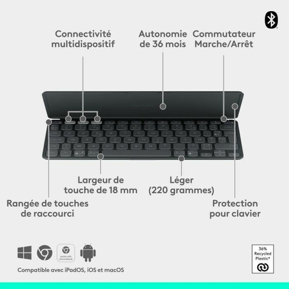 The Keys-to-Go 2 from Logitech is an iPad case with integrated keyboard that combines portability and functionality in a lightweight, compact design. It is made for users who need an efficient solution for typing on their tablet without sacrificing comfort or style, featuring an elegant graphite gray color that ensures discretion and versatility in any setting. This accessory includes Bluetooth connectivity, allowing easy wireless pairing compatible with various devices, offering freedom of movement and eliminating cable clutter. Its structure measures approximately 25 cm long and 10.5 cm wide, dimensions that fit most iPads perfectly, while its ultra-lightweight weight of only 220 grams makes daily transport easy without adding bulk or excessive load. The keyboard is configured with an AZERTY layout, especially aimed at the French market and other users who use this arrangement, providing a comfortable and efficient typing experience with highly responsive tactile keys. Additionally, the case protects the tablet from scratches and minor bumps, making it an ideal accessory for professionals, students, and regular users who need a compact, practical, and stylish solution to work or write from anywhere. Overall, the Keys-to-Go 2 by Logitech represents a modular and functional alternative to boost productivity on the go without compromising portability or style.