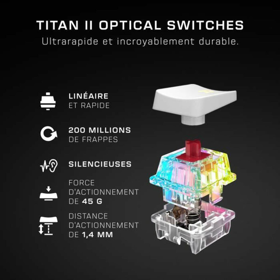 The TBK-3001-12-FR from Turtle Beach is a keyboard specially designed for gaming that combines functionality and style in a compact design exclusive to users who prefer the French AZERTY layout. This optical mechanical model stands out for its white finish, giving it an elegant and modern look, ideal for setups seeking sobriety and distinction. Its USB connection ensures fast and stable response without interference, an essential feature for competitive gaming where every millisecond counts. The keyboard features optical mechanical switches that provide precise and durable actuation, promoting a comfortable and efficient typing experience for long gaming or writing sessions. It has a compact, minimalist profile, presenting a lightweight and portable alternative for gamers and professionals who need a robust yet practical keyboard. Its gaming keyboard layout guarantees optimized performance for video games, supporting macros and key combinations that enhance interaction during intense matches. Made with high-quality materials that offer durability and comfort, it reinforces Turtle Beach’s reputation for gaming peripherals. In short, the TBK-3001-12-FR represents a balanced solution for those needing a reliable, functional mechanical keyboard with the French layout, adapted to the demands of modern gaming and daily work.