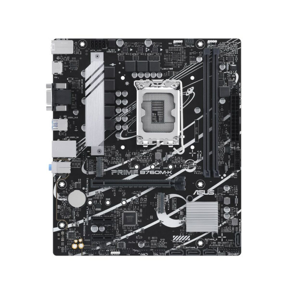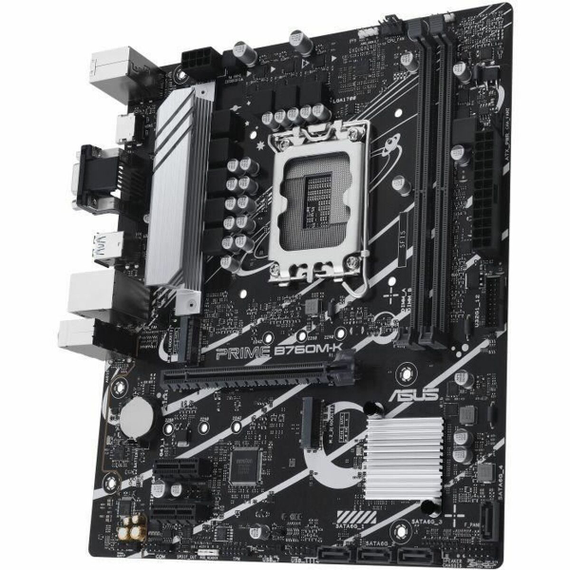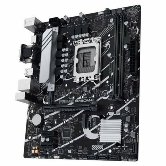 The Asus PRIME B760M-K motherboard is a robust and versatile solution designed for MicroATX systems requiring maximum compatibility and efficient performance. Equipped with the Intel B760 chipset and an LGA 1700 socket, it supports a wide range of Intel processors, including Celeron, Pentium Gold, Core i3, and Core i5 models, making it ideal for setups from basic offices to compact workstations. This motherboard features support for DDR5 SDRAM memory with a maximum capacity of 96 GB via DIMM slots, ensuring fast and smooth multitasking and demanding workloads. For audiovisual connectivity, it includes VGA and HDMI video outputs, facilitating connection to both modern and traditional monitors for various uses. Its storage options stand out with a combination of 4 SATA III ports and 2 M.2 slots, compatible with HDD and SSD drives, plus RAID 0, 1, 5, and 10 arrays to optimize data security and speed. Network connectivity is supported by a high-speed 2.5 Gigabit Ethernet interface, suitable for environments requiring fast and stable data transfers. Complementing its ports are multiple USB options, including 5 USB 3.2 ports for high-speed peripherals and several USB 2.0 ports, along with PS/2 ports for legacy devices. Its Micro ATX form factor allows easy installation in compact cases without sacrificing functionality or expansion. In summary, the Asus PRIME B760M-K is a well-balanced motherboard designed for users seeking reliable compatibility with the latest Intel processors and current connectivity and storage technologies, all in a compact and efficient format.