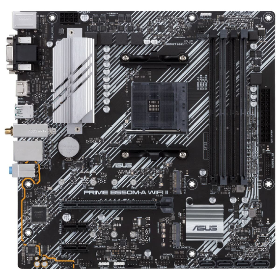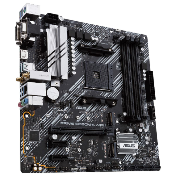 The Asus PRIME B550M-A WIFI II is a compact motherboard in MicroATX (mATX) format, designed for high-performance systems with AMD processors thanks to its B550 chipset and AM4 socket, compatible with 3rd and 5th generation Ryzen families, including Ryzen 3, 5, 7, and Ryzen 9. Supporting up to 128GB of DDR4-SDRAM memory via DIMM slots, it enables powerful and versatile setups suitable for demanding work environments and advanced gaming. This board features next-generation connectivity with Wi-Fi 6 (802.11ax) and Bluetooth 5.2 for fast, secure wireless connections, plus Gigabit Ethernet via the Realtek RTL8111H controller. It offers extensive storage options with 4 SATA III ports and 2 M.2 slots, compatible with both HDD and SSD, as well as support for PCI Express 4.0 and 3.0, ensuring speed and flexibility for system expansion. Graphic outputs include VGA, DVI, and HDMI, covering all display needs, while peripheral connections are completed with multiple USB Type-A and USB-C ports, PS/2 for classic keyboard/mouse, and integrated audio. The black color design provides a discreet, professional look, ideal for custom or corporate builds. This Asus model stands out for offering advanced technology features and comprehensive connectivity in a compact format, making it an excellent foundation for modern configurations in limited spaces.