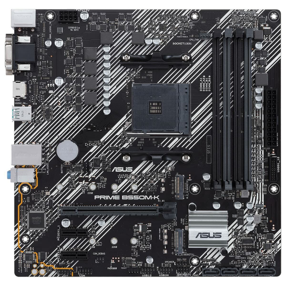 The Asus PRIME B550M-K is a MicroATX motherboard designed for systems that require a balance between compactness and performance, offering full compatibility with 3rd Gen AMD Ryzen processors thanks to its AMD AM4 socket and AMD B550 chipset, ensuring support for the latest technologies within the Ryzen ecosystem. It supports up to 128 GB of DDR4-SDRAM memory at speeds up to 4600 MHz (OC), distributed across four DIMM slots, enabling advanced configurations for both professional tasks and gaming. Storage connectivity is extensive, with 2 M.2 slots ideal for high-speed NVMe drives and 4 SATA3 ports for conventional HDDs and SSDs. Video output options include HDMI, VGA, and DVI ports, making it easy to connect to a variety of monitors and providing flexibility in different work environments. Additionally, it features 6 USB 3.2 ports for fast peripheral connectivity, as well as USB 2.0, PS/2 ports, and Ethernet support via the Realtek RTL8111H Gigabit LAN controller for stable and fast data transmission. Native support for Windows 10 ensures smooth integration with current operating systems. The compact micro ATX design allows installation in small cases without sacrificing expansion and connectivity options. In summary, the Asus PRIME B550M-K stands out as a solid, versatile, and well-equipped solution for those seeking reliability and advanced features in the mid-range AMD motherboard segment.