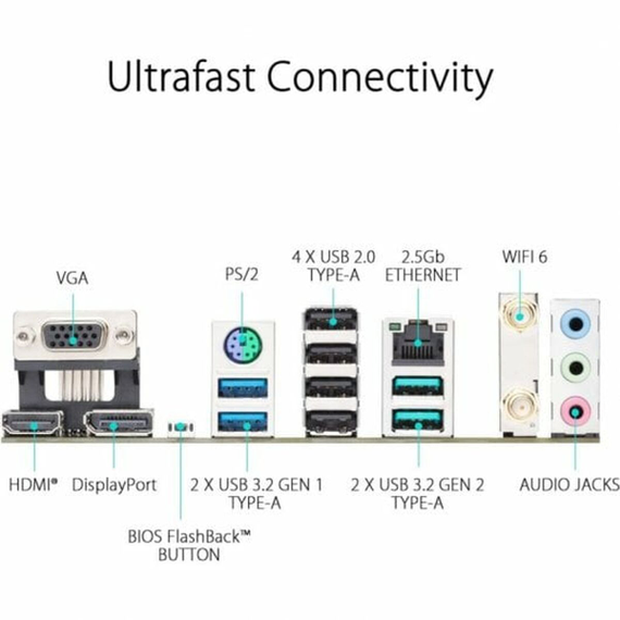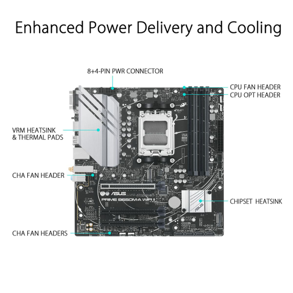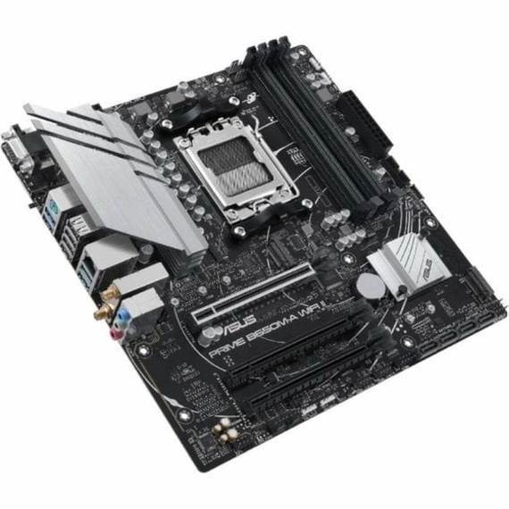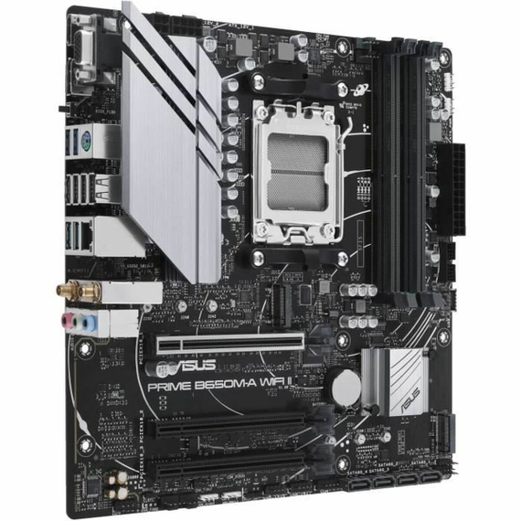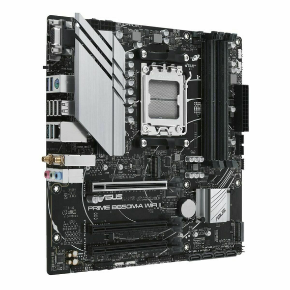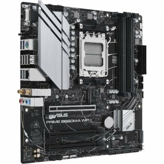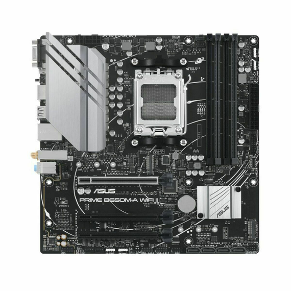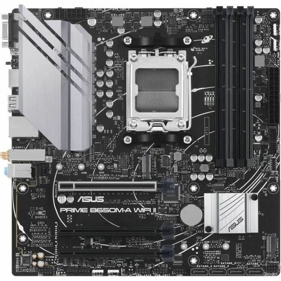 The Asus PRIME B650M-A WIFI II motherboard is a solid and versatile solution designed for users who need an efficient and modern platform with support for the latest AMD components. It features the AMD B650 chipset and an AMD AM5 socket, compatible with the new generation of AMD processors, ensuring optimal performance in demanding tasks and current games. Its microATX form factor offers a perfect balance between compact size and functionality, ideal for systems with limited space without sacrificing connectivity or expansion. This motherboard includes advanced network connectivity thanks to its Intel Wi-Fi 6 chipset, allowing fast and stable wireless connections, as well as essential ports like HDMI, USB 2.0, and traditional ports such as VGA and PS/2, facilitating connection of peripherals and monitors of various ages. Its design and features position it as a recommended option for users looking to build desktop PCs with current technology, optimizing both performance and compatibility with modern components and a wide range of external devices. This motherboard offers technical support and build quality that uphold Asus’s reputation in the PC hardware segment, balancing functionality, connectivity, and efficiency in a compact form factor.