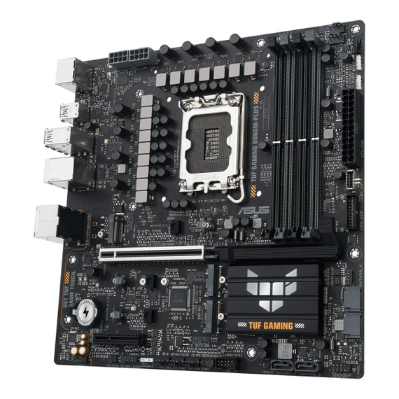 The ASUS TUF GAMING B860M-PLUS motherboard is a Motherboard specially designed to build or upgrade high-performance and reliable desktop PCs. Equipped with the Intel B860 chipset, it supports processors using the LGA 1851 (Socket V1) socket, compatible with the latest Intel CPU generations, providing an updated platform ready for demanding tasks and gaming. Its MicroATX (mATX) form factor makes it a compact option with enough capabilities and connectivity for mid-sized systems, optimized for limited spaces without sacrificing functionality. The board includes multiple connectivity options, such as HDMI ports for high-definition video, various traditional USB ports, and USB-C for modern devices and fast data transfer. It also features Gigabit Ethernet networking, ensuring stable and fast connections for online gaming and data streaming. Compatible with operating systems like Windows 11 and PC platforms, it guarantees a smooth, up-to-date experience and easy driver and software installation. The ASUS TUF GAMING B860M-PLUS is designed for users who need a solid, durable micro ATX motherboard, ideal for setups seeking a balance between size, performance, and advanced connectivity. In summary, this motherboard offers a reliable, modern foundation to build PCs capable of handling everything from daily tasks to demanding gaming and multitasking applications.