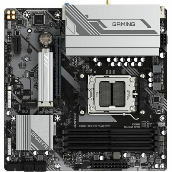 The Gigabyte B650M GAMING PLUS WF motherboard is a MicroATX motherboard specially designed to enhance desktop systems with AMD processors, featuring the modern AMD AM5 socket that ensures compatibility with the latest generation of AMD CPUs. Equipped with the AMD B650 chipset, this model offers an ideal balance between performance and features, suited for users seeking a versatile system ready for gaming or advanced tasks. Its integrated connectivity stands out, including Bluetooth and Wi-Fi, enabling stable and fast wireless connections, as well as Gigabit Ethernet for high-speed wired connections. For video output, it includes an HDMI port allowing easy connection to compatible monitors or TVs, ensuring a good audiovisual experience. Its compact MicroATX form factor allows integration into smaller cases without sacrificing expansion options or thermal management quality. Additionally, it includes a CR2032 battery to preserve essential settings and data when the system is powered off. The B650M GAMING PLUS WIFI by Gigabyte is a complete and up-to-date solution that meets the needs of users looking for a reliable motherboard with good performance and advanced connectivity to build modern, efficient systems.