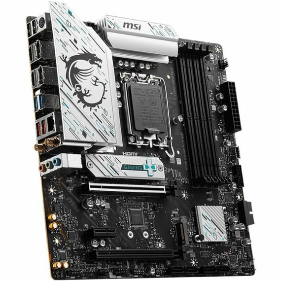 The MSI B760M GAMING PLUS WIFI is a motherboard designed for high-performance systems featuring the Intel B760 chipset, compatible with LGA 1700 socket processors, including Intel® Celeron® and Intel® Pentium® Gold, providing a solid foundation for efficient and versatile systems. Its Micro ATX (mATX) form factor of 243.8 x 243.8 mm offers a perfect balance between compact size and multiple expansion options. It supports up to 192 GB of DDR5-SDRAM memory at speeds up to 6800 MHz via four DIMM slots in dual-channel configuration, ensuring responsive performance for demanding tasks and gaming. For storage, it provides M.2 and SATA III interfaces, with RAID 0, 1, 5, and 10 support to maximize data security and access speed. In connectivity, this motherboard stands out with options like Wi-Fi 6E (802.11ax) for ultra-fast, stable wireless connections, complemented by Bluetooth 5.3 for peripheral devices. It also includes a 2.5 Gigabit Ethernet port for high-performance wired local networks. Regarding ports, it features four USB 2.0, four USB 3.2 Gen 1, and one USB 3.2 Gen 2 port, alongside dual HDMI 2.1 and DisplayPort 1.4 outputs, enabling multiple monitor setups with support for high resolutions and refresh rates. For audio, it integrates a Realtek ALC897 chipset delivering 7.1-channel surround sound, enhancing multimedia experience, especially in gaming and video playback. Its 256 MB UEFI AMI BIOS offers a modern interface with advanced functions, including a CMOS clear jumper for easy setup and recovery. For cooling and aesthetics, it provides CPU fan and RGB LED strip connectors, allowing for a stable and customized system. This motherboard supports Windows 10 and 11 operating systems, ensuring compatibility and access to the latest updates and features. In summary, the MSI B760M GAMING PLUS WIFI is a complete solution for users seeking a balanced, reliable PC ready for advanced connectivity in a compact form factor.