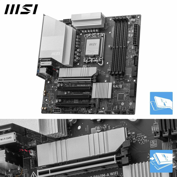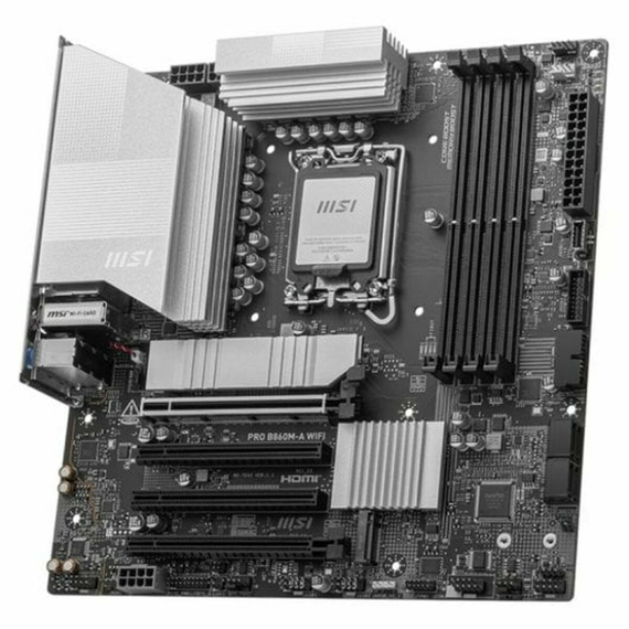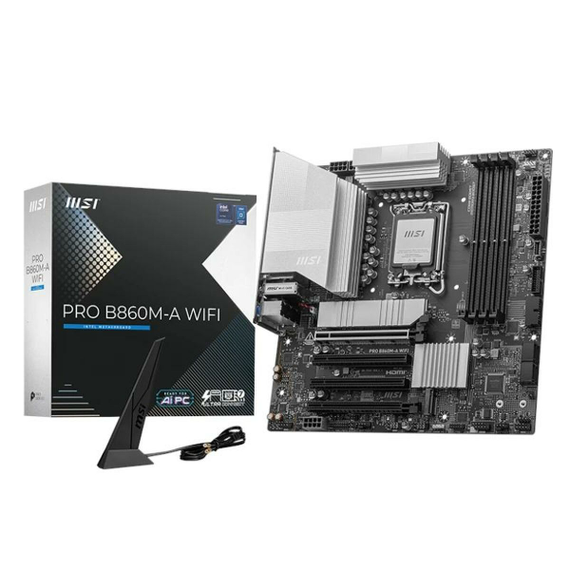 The MSI PRO B860M-A WIFI is a motherboard specifically designed for high-performance and reliable systems, compatible with the new generation of Intel processors thanks to its LGA 1851 socket (Socket V1). This motherboard features an Intel B860 chipset, providing an optimal balance between efficiency and expandability, allowing robust configurations aimed at both professional environments and advanced users who demand stability and advanced connectivity. Its MicroATX (mATX) form factor enables versatile integration in compact cases without sacrificing expansion options, ideal for those seeking to save space without giving up the ability to add multiple devices. It includes Wi-Fi wireless connectivity, facilitating network connection without cables, along with USB and USB-C ports that ensure compatibility with most modern peripherals and fast, easy data transfer. The black design and sturdy build offer a reliable and aesthetic base for custom systems, while the built-in display enhances direct management and monitoring capabilities. Overall, the MSI PRO B860M-A WIFI combines advanced technology, a compact design, and support for the latest Intel platforms, making it a solid choice for builders and users who prioritize connectivity, performance, and durability in a professional-grade motherboard.