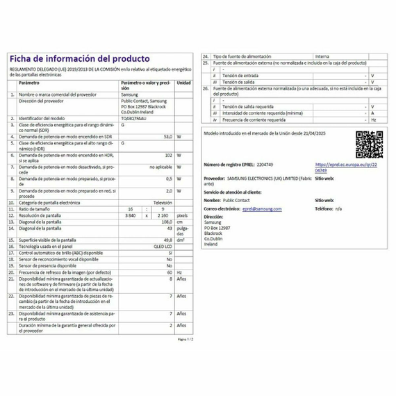 The Samsung TQ43Q7F Smart TV with a 43-inch screen offers an advanced visual experience thanks to its QLED 4K Ultra HD display with 3,840 x 2,160 pixels, delivering high detail and vivid color, enhanced by technologies like HDR 10+ for superior dynamic range and improved contrast through Mega Contrast and UHD Dimming. Its 50 Hz refresh rate and Motion Xcelerator technology ensure smooth viewing of moving content. Image processing with 4K Upscaling optimizes lower-resolution content to fully utilize native 4K potential. For connectivity, it includes Wi-Fi 5 and Bluetooth 5.3, plus a full set of ports: 3 HDMI 4K at 60 Hz, a USB-A port, Ethernet, and combined RF inputs for terrestrial, cable, or satellite signals, along with a CI slot for conditional access modules. This model is a Smart TV with Tizen OS, integrating smart features like web browsing, voice assistants compatible with Alexa and Google Assistant, and an IoT ecosystem including SmartThings Hub and Matter Hub for unified device management. Multimedia offerings include Samsung TV Plus and an electronic program guide (EPG) available in several European countries. Audio quality is supported by technologies such as Object Tracking Sound Lite, Q-Symphony, and a 20 W 2CH speaker system for immersive, adaptive sound. Regarding efficiency, this TV holds a G energy rating and features like ECO sensor, auto power off, and energy-saving mode to optimize consumption, with a maximum of 115 W in use and 0.5 W in standby. Its compact size and light weight of 7.4 kg facilitate installation, with VESA 200 x 200 mm support for wall mounting. Overall, the Samsung TQ43Q7F is a balanced choice for those seeking advanced image quality and smart connectivity in a 43-inch format, suitable for medium-sized spaces and users who value a complete audiovisual experience within the mid-range TV segment.