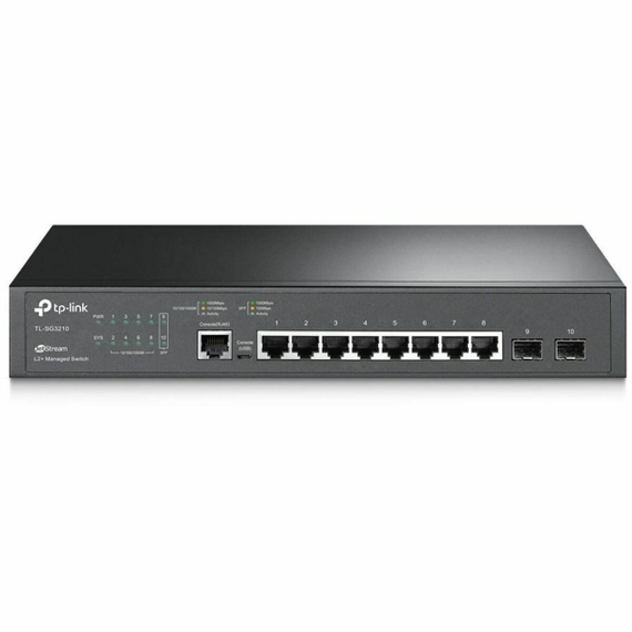 The TP-Link TL-SG3210 managed switch is an advanced solution for corporate networks requiring efficient management and high performance. This managed L2 switch features 8 Gigabit Ethernet RJ-45 ports that provide fast and stable connections at 10/100/1000 Mbps speeds, ideal for intensive data transmission and maintaining quality of service. It also includes 2 SFP slots for fiber optic connections, allowing network expansion with long-distance or higher-capacity links. With a total switching capacity of 20 Gbit/s and a MAC address table supporting up to 8000 entries, the TL-SG3210 is designed to handle high traffic density and ensure efficient addressing in demanding environments. Its support for network standards such as IEEE 802.1p, 802.1Q, 802.1s, 802.1v, 802.1w, and 802.1x guarantees compatibility with advanced QoS, VLAN, link aggregation, and security features, enabling flexible and secure network management. This device supports rack mounting for easy integration into professional infrastructures and includes LED indicators to monitor network and port status instantly. Built with high-quality materials, its casing combines black and grey elements and is made of durable plastic, providing robustness and a sober look suitable for corporate environments. Although Wi-Fi connectivity is mentioned in its features, its main function focuses on wired Ethernet connectivity, making it optimal for ensuring stable and fast connections in offices, data centers, and small businesses. The TP-Link TL-SG3210 also supports Power over Ethernet (PoE), increasing its versatility to connect devices like IP cameras or VoIP phones without separate power sources. Overall, this switch combines advanced management capabilities with robust and flexible hardware, positioning it as a reliable choice to optimize performance and security in professional network infrastructures.