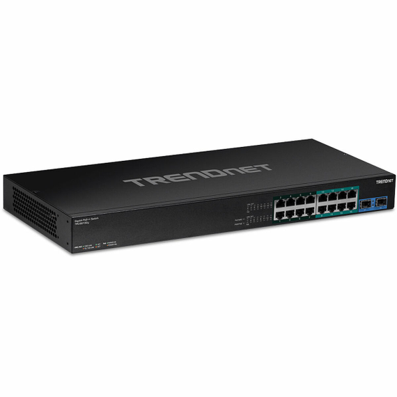 The Trendnet TPE-BG182G switch is an unmanaged device designed for environments requiring high efficiency in network management with support for high-power Power over Ethernet (PoE). It features a sturdy black metal 1U chassis for 19-inch rack mounting, ensuring durability and easy integration into professional infrastructures. This model offers a total of 18 RJ45 Gigabit Ethernet ports (10/100/1000 Mbps), of which 8 are basic switching ports for direct connections, supporting full duplex mode communication. Additionally, it includes SFP slots that allow fiber optic connections to extend the network over long distances, enabling a flexible hybrid wired and fiber network. Its switching capacity reaches 36 Gbit/s and it has a MAC address table with up to 8000 entries, ensuring efficient and fast data traffic handling. Compatible with standards such as IEEE 802.3af, 802.3at, and 802.3bt, it provides full support for fourth-generation PoE (4PPoE), delivering up to 30 W power per port, suitable for powering devices like IP cameras, VoIP phones, and wireless access points without external power sources. It operates at 220 V, and the metal material ensures durability and optimal heat dissipation. Thanks to its unmanaged design, this switch is ideal for simple deployments requiring gigabit capacity combined with power over the same cable, simplifying installation and maintenance of small to medium business networks. In summary, the Trendnet TPE-BG182G offers a reliable and robust solution to increase connectivity and power over Ethernet in professional infrastructures, maintaining an excellent balance between performance and ease of use.