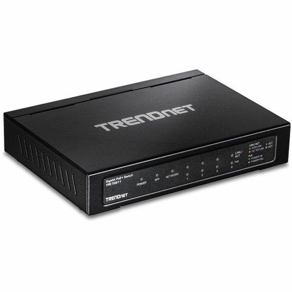 The Trendnet TPE-TG611 switch is a robust and efficient device designed for network environments requiring reliable connectivity and simplified power delivery through a single cable. This compact black model, made of metal, features a total of 6 ports, including four gigabit PoE+ ports that provide up to 65 W total PoE power to supply compatible devices such as wireless access points, IP cameras, VoIP phones, and access control systems without needing additional adapters. It also includes an extra gigabit port and an SFP slot for connecting multimode or single-mode fiber optic modules, enabling network expansion over long distances with stability and high speed. The integrated PoE technology simplifies electrical infrastructure by using a single Ethernet cable for both data and power, reducing costs and easing installation in commercial and industrial settings. This switch operates with recognized network standards such as IEEE 802.3af and 802.3at, supports full duplex to maximize performance, and has a MAC address table capacity of 2000 entries, ensuring efficient switching with a total capacity of 12 Gbit/s. Its input voltage is 55 V DC with typical power supply of 220 V and maximum power of 65 W, complemented by a wall-mount option that facilitates integration in various environments. The metal construction provides durability and better heat dissipation. Overall, the Trendnet TPE-TG611 is a compact gigabit switch that optimizes PoE connectivity and power in medium-sized networks, ideal for professionals needing reliability and versatility in managing devices connected via Ethernet and fiber optics.